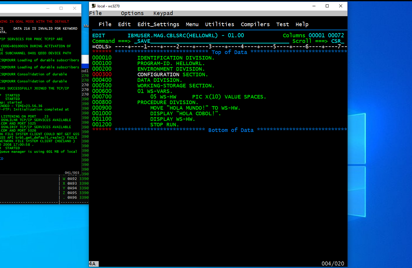 En member ingresamos el nombre que llevará nuestro programa COBOL. En este caso 'HELLOWRL'