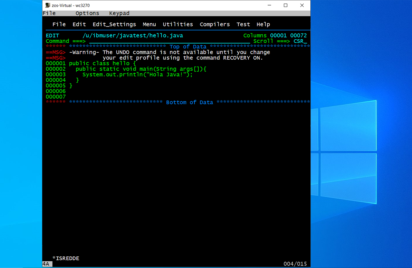 Al iniciar la consola UNIX nos mostrará en la carpeta 'IBMUSER:/u/ibmuser: >'. Con 'mkdir javatest' crearemos la carpeta 'javatest'.