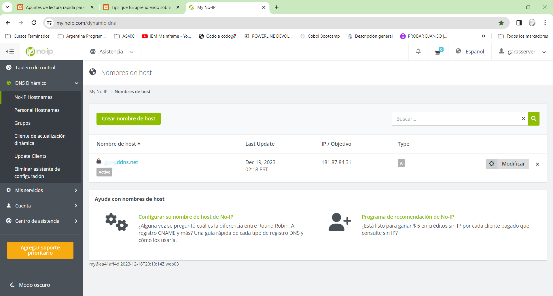 Una vez registrados en NO-IP, vamos a crear el nombre con el que querramos acceder al servidor, por ejemplo 'hercules.ddns.net' (puede ser otro...).