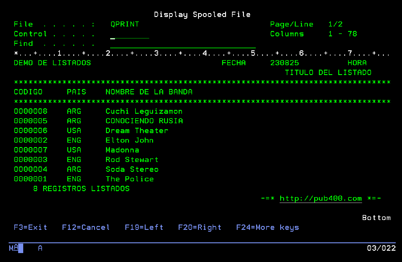 Una vez compilado y ejecutado el programa, se genera en el spool un QPRINT con el listado que se ve como muestra el siguiente grafico.